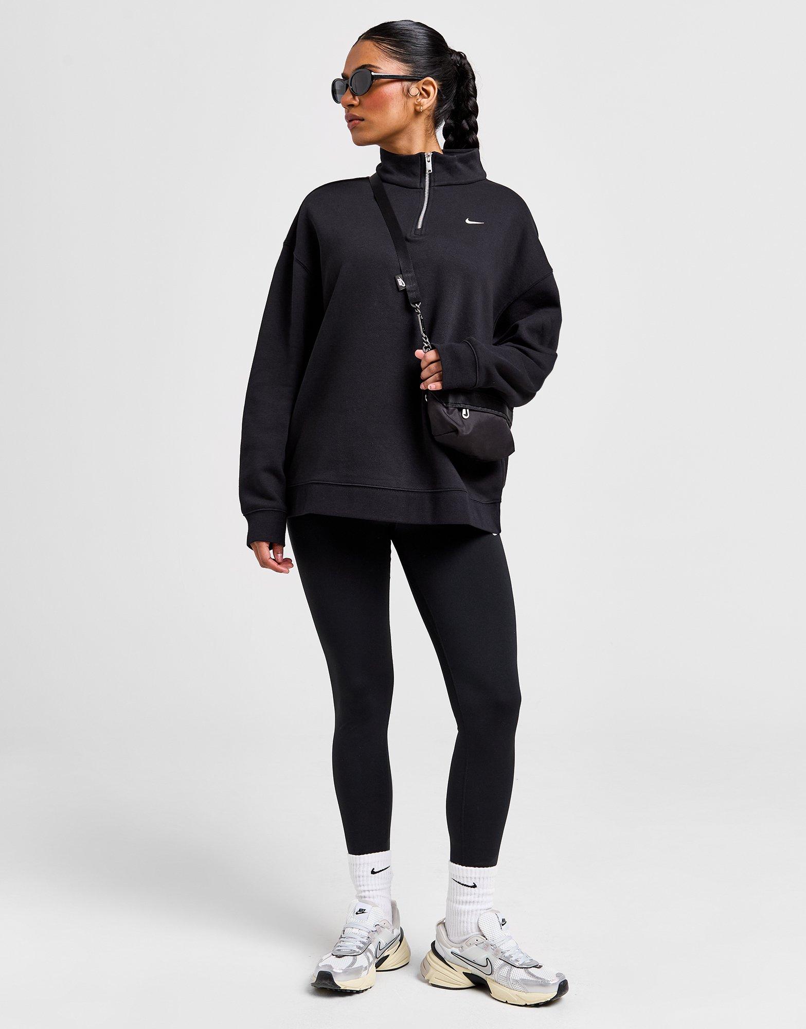 Ga voor een aansluitende basis met deze Swoosh Fleece 1/4 Zip Top van Nike. Deze zwarte oversized top is gemaakt van een ultrazachte en behaaglijke katoenpolyestermix voor warm, comfortabel dragen. Het heeft een 1/4 ritssluiting met een opstaande kraag voor persoonlijke bedekking, terwijl de geribde boorden de pasvorm verbeteren. Afgewerkt met Nike-branding op de borst en achterkant. Mag in de wasmachine. | Ons model is 1,80 meter en draagt maat small.